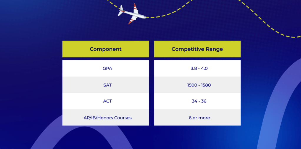 A SAT score above 1500 or an ACT score above 34 makes you competitive. However, admissions are holistic. Strong essays, leadership, and achievements can balance slightly lower test scores.